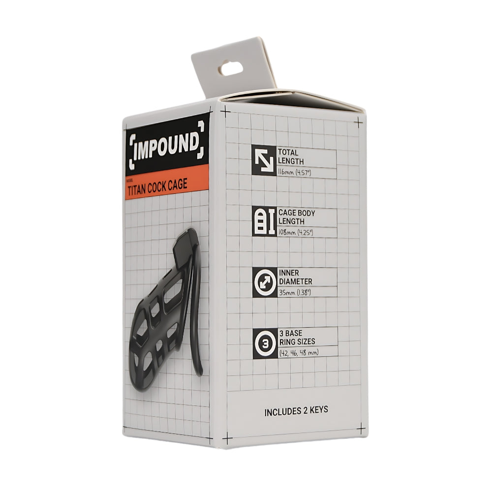 Step up your chastity game with the Impound Titan Cock Cage - a bold, breathable, and lightweight device built for both comfort and control. Featuring a sleek black design with an open-structured cage, the Titan allows for airflow and hygiene without compromising on restriction. With a total length of 116mm and an inner diameter of 35mm, it provides a snug and secure fit. Complete with three base ring sizes for a customizable experience, the Titan is crafted from 95% ABS and 5% metal - strong, stylish, and perfect for extended wear.